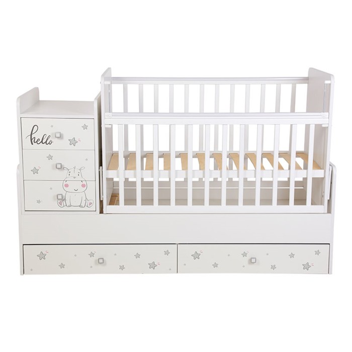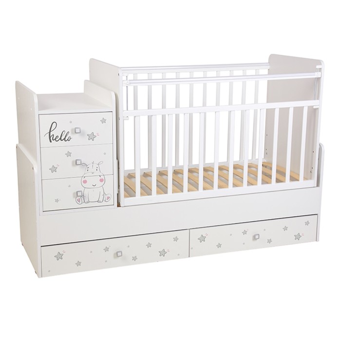 - Комод кроватки имеет пеленальную поверхность с закруглёнными бортиками по бокам
