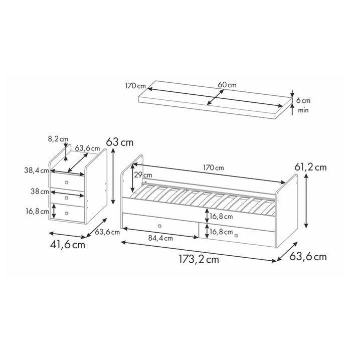 - Трансформируется в подростковую кровать, где размер ложа 60х170 см, и независимую приставную тумбу