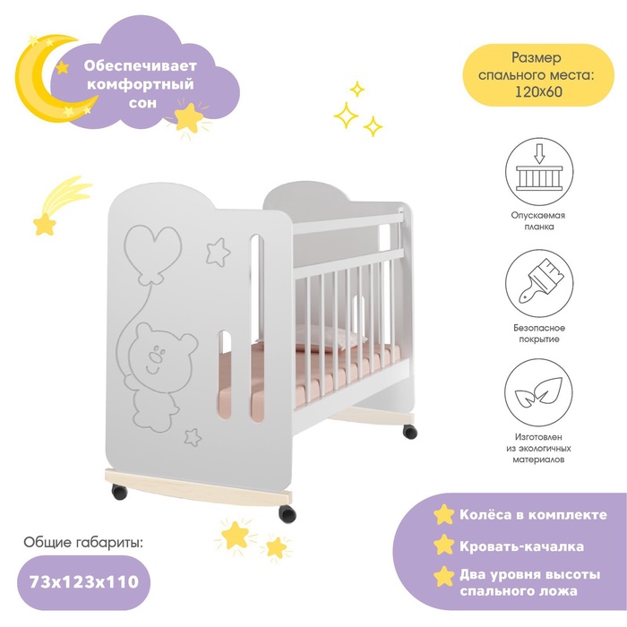 При снятых колесах кроватка превращается в качалку: успокоить и убаюкать новорожденного для вас не составит труда. Вам больше не придется низко наклоняться, чтобы уложить или достать из кроватки малыша. Планка и высота подматрасника регулируются. Мебель выполнена из натуральных материалов.