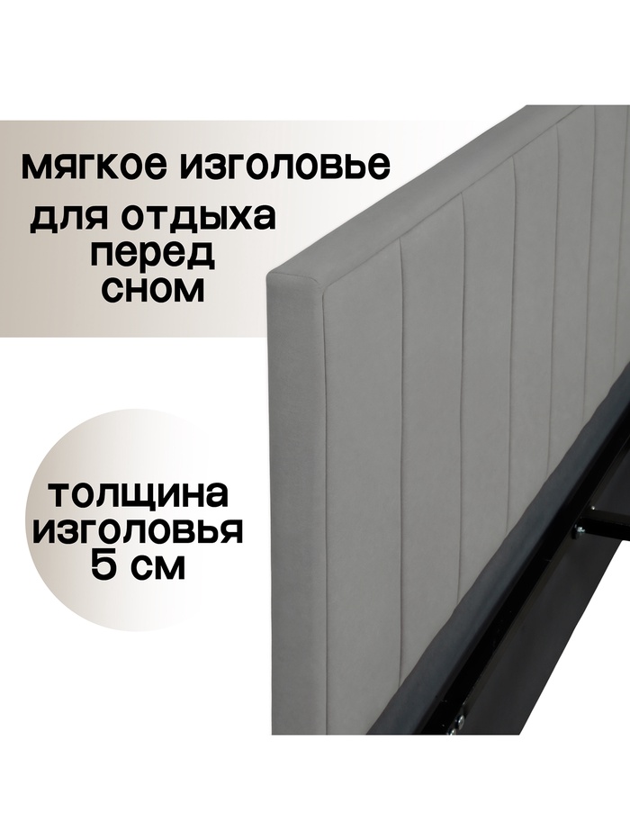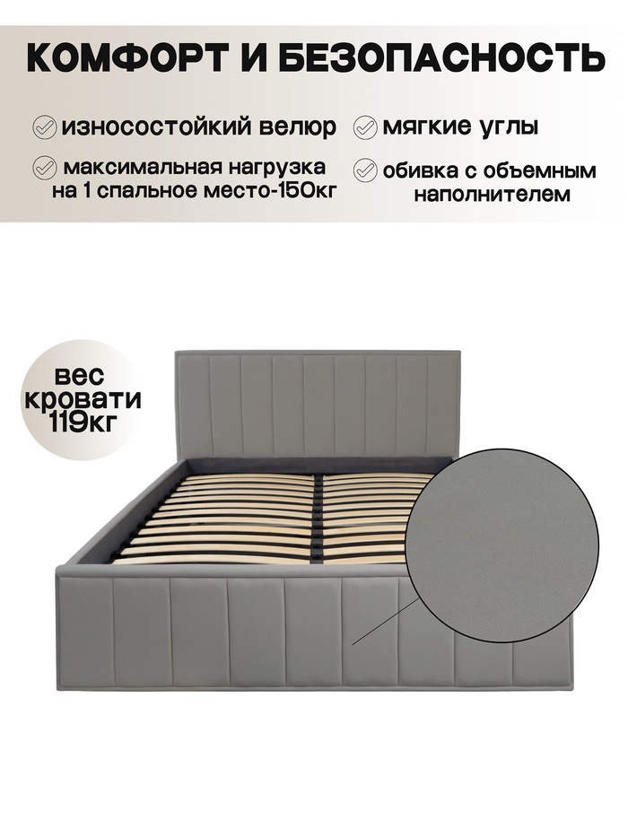 Кровать двуспальная «Лана», с мягким изголовьем, с подъёмным механизмом, 1600×2000 мм, велюр, цвет серый