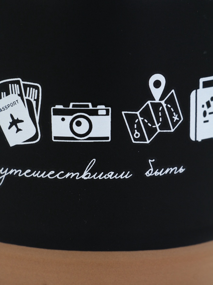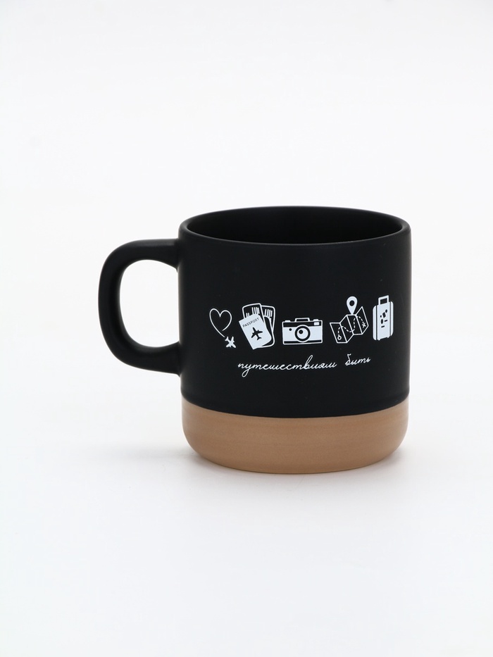 Кружка «Путешествиям быть» — не призыв, а тихое подтверждение: мечты о дороге не рассеиваются, они ждут своего часа. Чёрная поверхность, как небо перед рассветом, бежевый низ — как песок под ногами, и линия из самолётика, карты, фотоаппарата, загранпаспорта и чемодана — как маршрут, начерченный без спешки. Под ними — фраза, в которой решимость и лёгкость идут рука об руку: ”Путешествиям быть”.