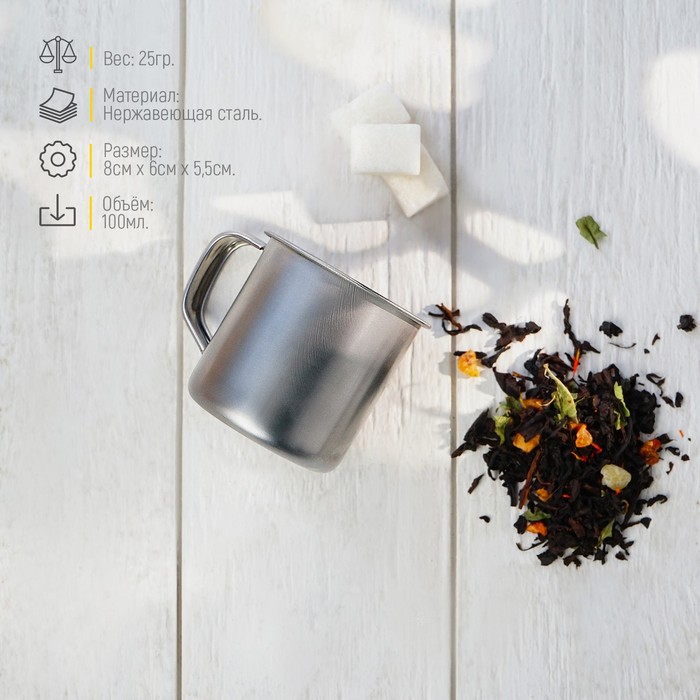 Компактный размер для удобства в путешествиях и на природе. Металлическая кружка объёмом 100 мл выполнена из нержавеющей стали. Минималистичный дизайн и гладкая поверхность делают её практичным аксессуаром для туризма и активного отдыха.