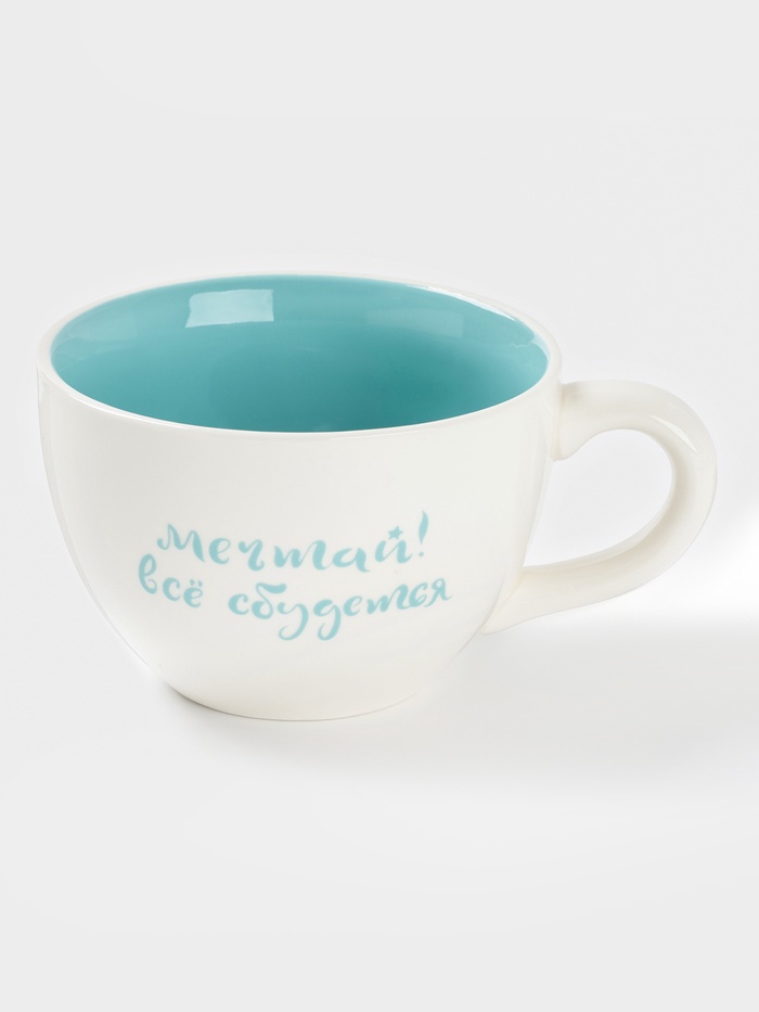Нежная керамическая кружка большого объема (475 мл) в бело-бирюзовых тонах. С милой фигуркой внутри и вдохновляющей надписью «Мечтай, все сбудется!». Идеальна для тех, кто верит в свои мечты и идет к ним. Подходит для использования в микроволновой печи и посудомоечной машине.