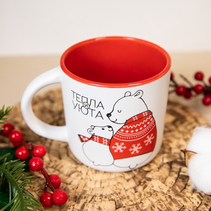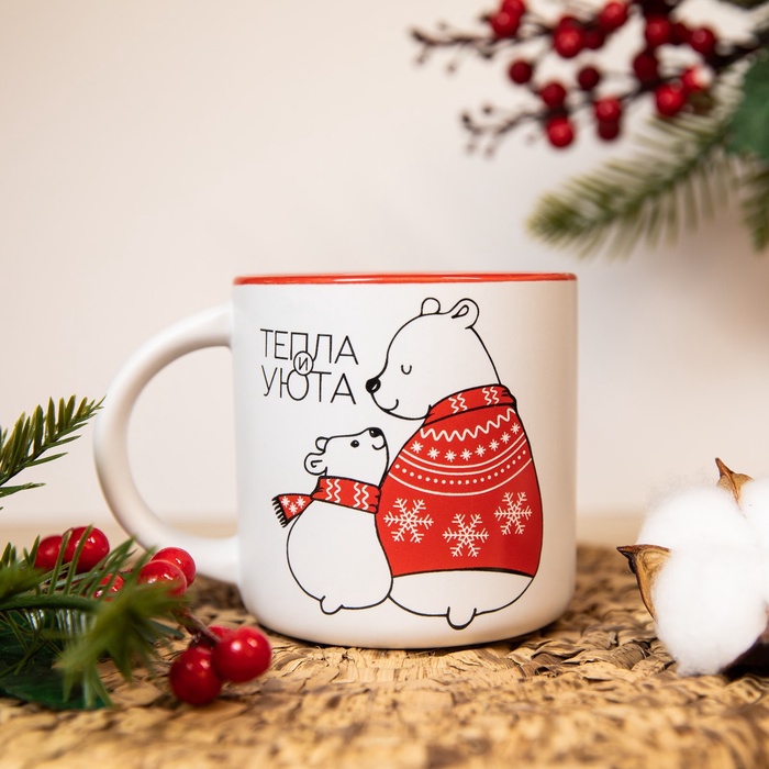 Кружка «Тепла и уюта» — это объятие в керамике. Белая снаружи, как первый снег на подоконнике, красная внутри — как отблеск камина на стенах. А на поверхности — белый медведь в красном свитере и рядом малыш в шарфике того же цвета: не герои сказки, а двое, которые уже нашли своё место у огня. Надпись ”Тепла и уюта” расположена просто, без восклицаний — как подпись под фотографией в семейном альбоме: не заявление, а констатация.