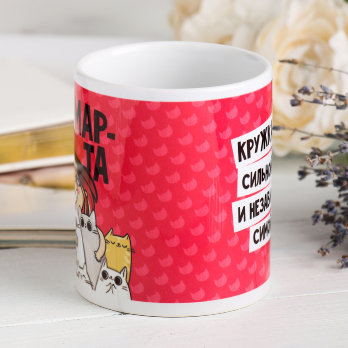 Кружка изготовлена из керамики. Рисунок нанесён методом сублимации, при котором краска проникает в верхний слой изделия, поэтому изображение получается стойким.