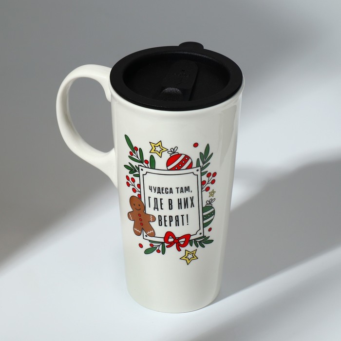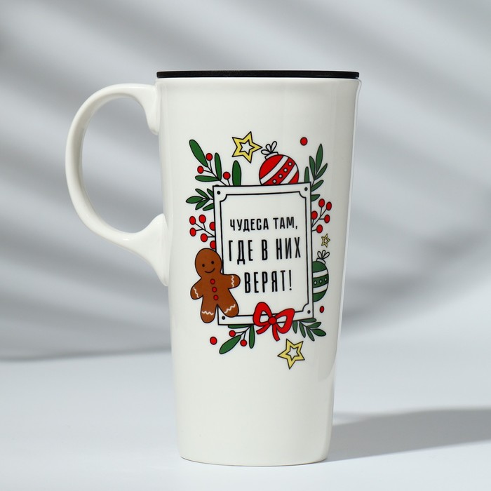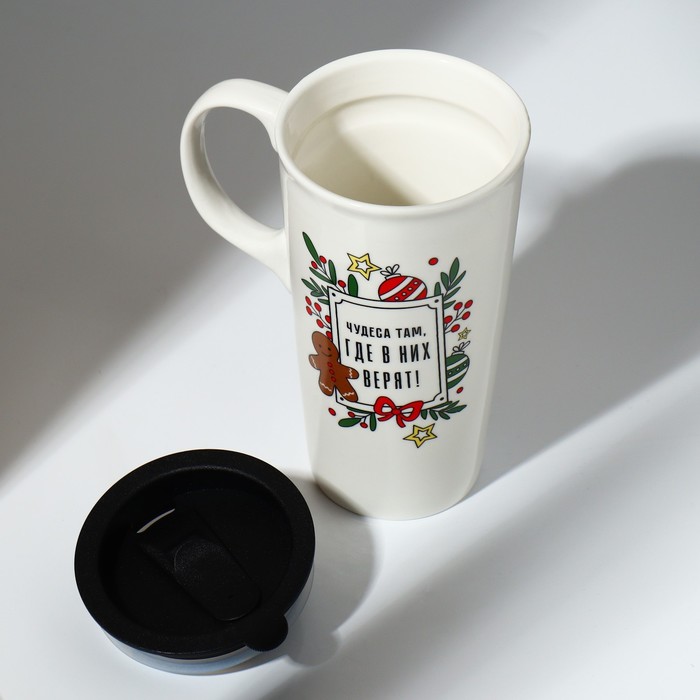 Кружка керамическая с крышкой «Чудеса там, где в них верят», 550 мл, цвет белый