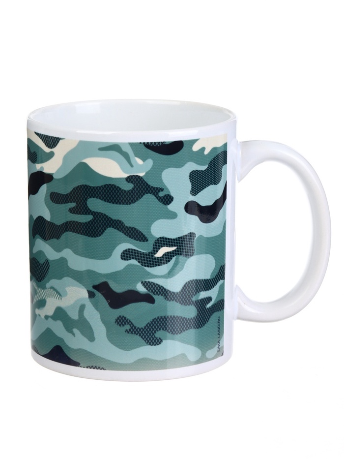 - Белая керамика с камуфляжным принтом и праздничной надписью выполнена методом сублимации — изображение не выцветает и не стирается со временем.
