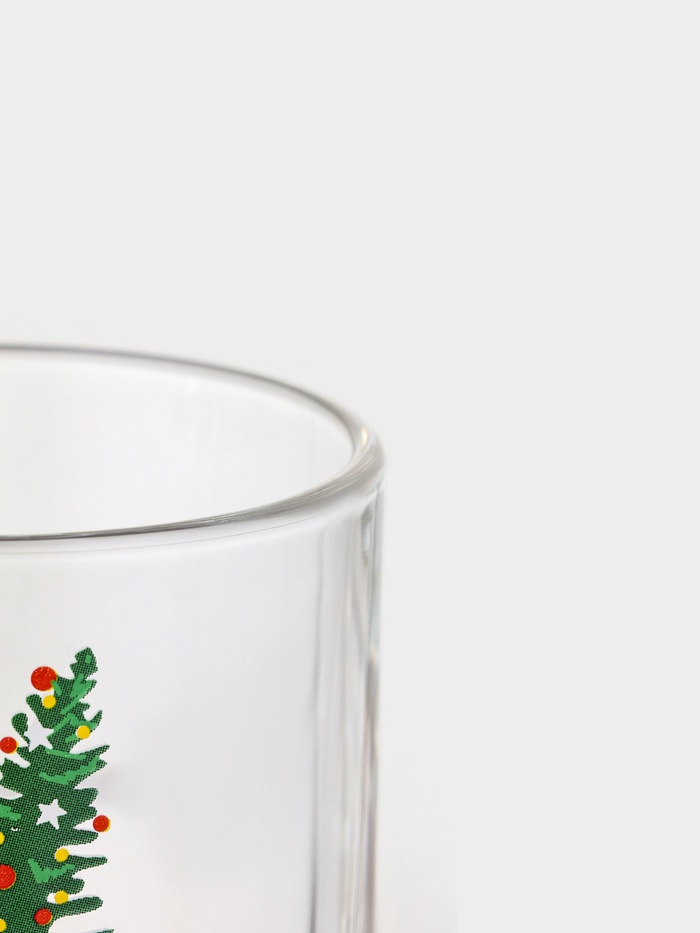 - Новогоднее настроение в деталях: на прозрачной поверхности — праздничный рисунок. Он не отвлекает от напитка, но подчеркивает атмосферу праздника без излишеств.