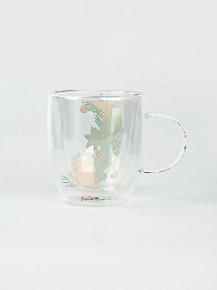 - Оригинальный дизайн: прозрачная кружка с двойными стенками выглядит стильно и празднично.