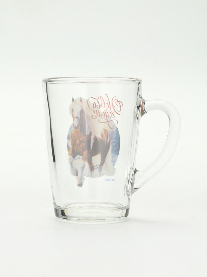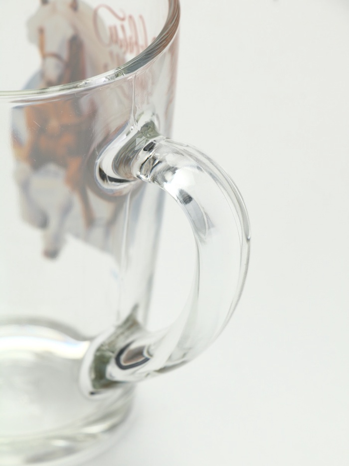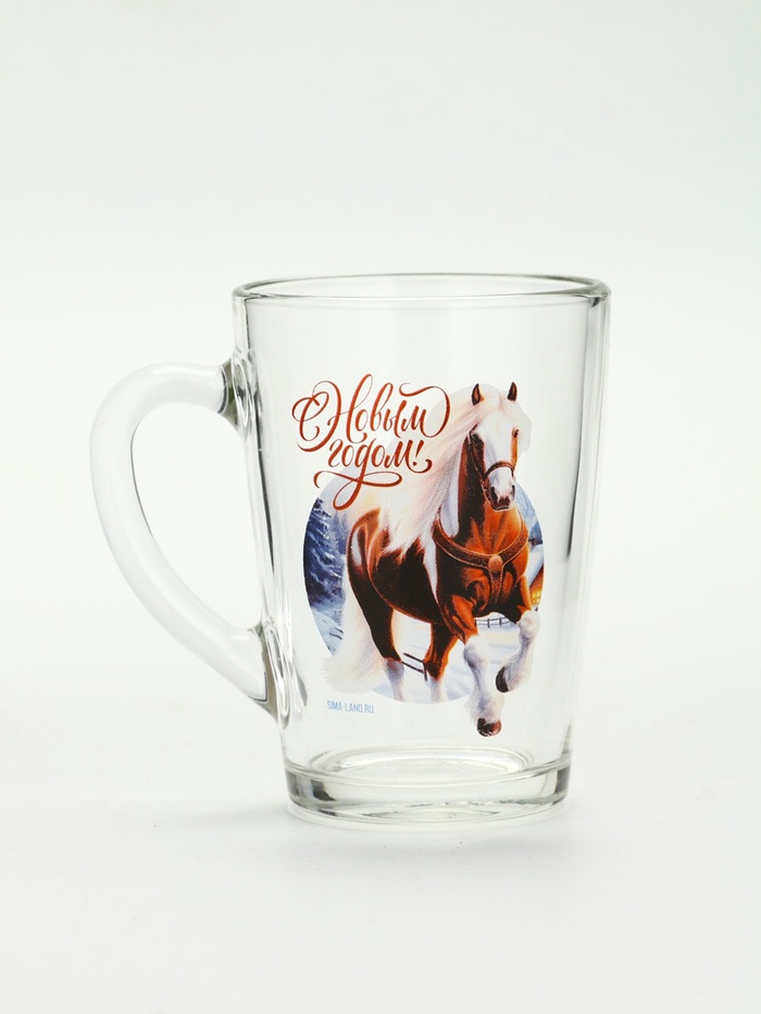 Кружка «С Новым годом» — это первый галоп нового времени, застывший в прозрачном стекле. На фоне чистой поверхности — лошадь в скаку: не статичный символ, а живое движение, с развевающейся гривой и лёгким наклоном головы, будто она уже видит горизонт. Рядом — фраза ”С Новым годом”, написанная без даты, без пафоса: как приветствие, а не как церемония. Это не прогноз на 2026-й — это *пожелание скорости*, силы, лёгкости в старте.