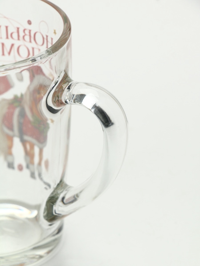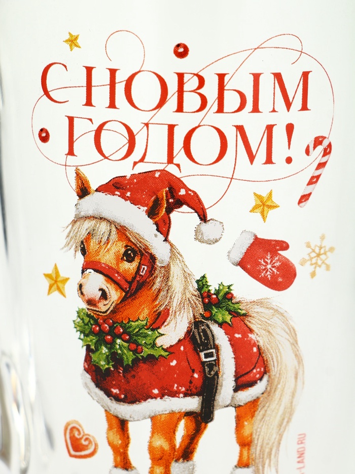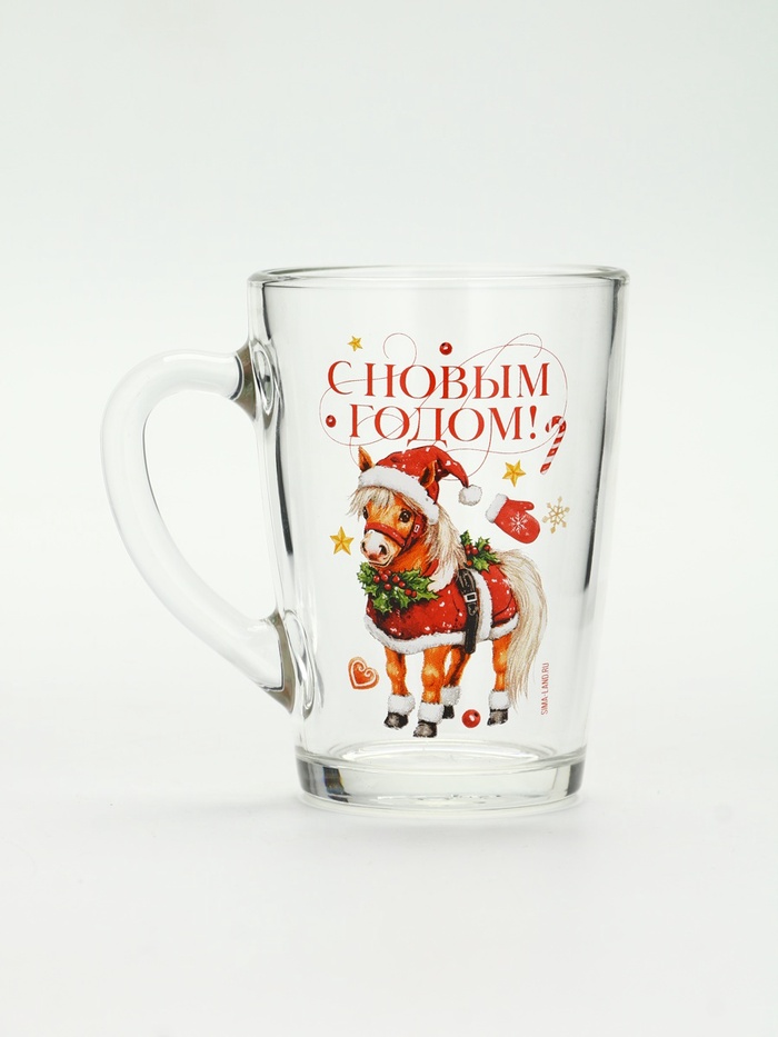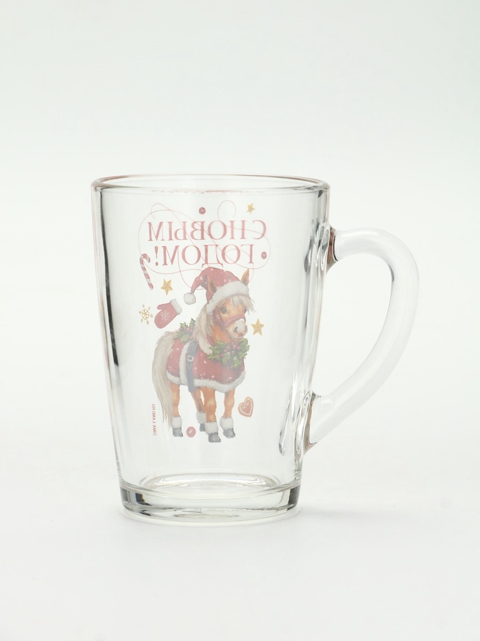 Кружка «С Новым годом» — это добрая улыбка, замороженная в стекле. Прозрачное основание, как чистое утро после снегопада, и на нём — пони в новогоднем костюме Деда Мороза: не карикатура, не шутка, а трогательная, чуть неуклюжая попытка быть волшебной. Шапка с кисточкой чуть съехала, а глаза — полные уверенности. Надпись ”С Новым годом” расположена просто, без восклицаний — как подпись под семейной фотографией: не идеально, зато по-настоящему.