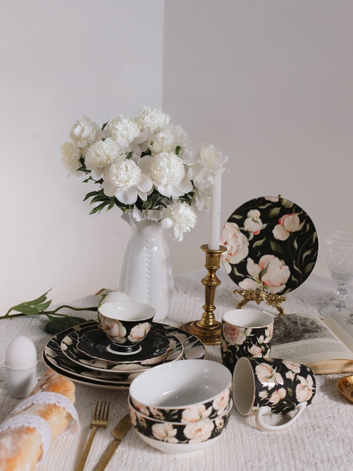 Изготовленная из нового костяного фарфора, эта кружка сочетает в себе стиль и изысканность. Цветочный рисунок на черном фоне создает потрясающий контраст, добавляя роскоши в ваш день.