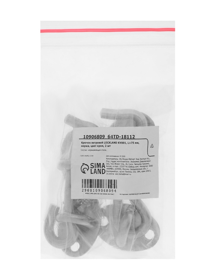 Крючок ветровой LOCKLAND KV001, L=75 мм, нержа, цвет хром, 2 шт
