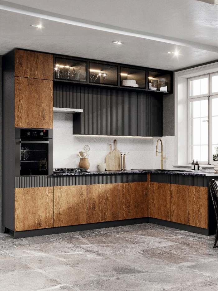 Трехуровневая Кухня «Престиж» – это практичное решение для создания стильной и функциональной кухонной зоны. Ее фасады с точным воспроизведением выразительных древесных текстур добавляют ощущение надежности и комфорта. Навесные фасады в цвете графит с вертикальными, графичными линиями, придают элегантность и лаконичность. Кухонный гарнитур обращает на себя внимание и станет украшением вашего дома.