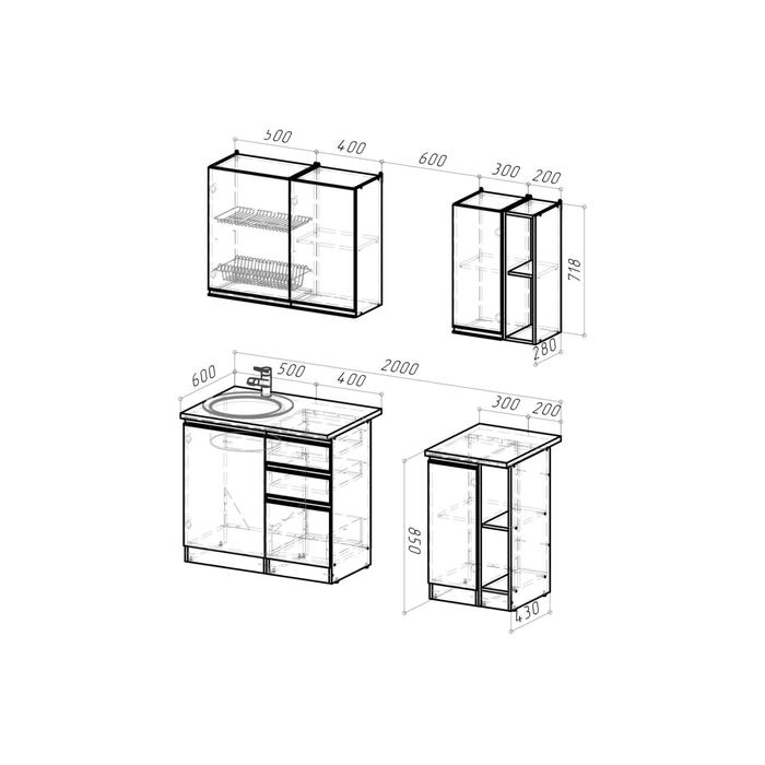 - Открытый навесной шкаф (Ш × Г × В): 200 × 300 × 720 мм.