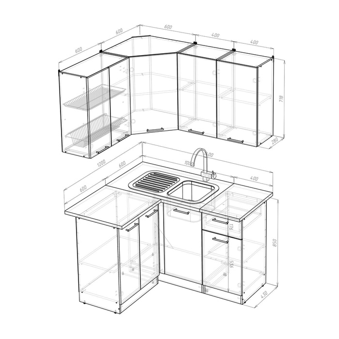 Кухонная мойка, стеновая панель, решётка для посудосушителя в комплект не входят.