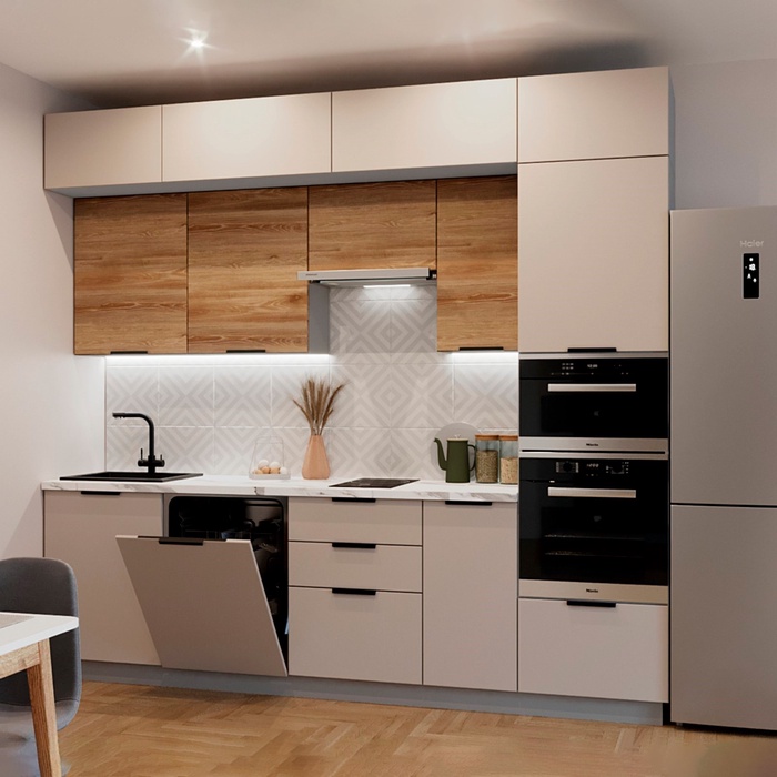 Кухонный гарнитур арт. 4 – функциональное решение для вашего дома. Представляет собой элегантное сочетание цветов, что придаст вашей кухне стильный вид. Включает в себя верхние и нижние шкафы, пенал, удобные ящики и вместительные полки. Отличается своей долговечностью и устойчивостью к износу.