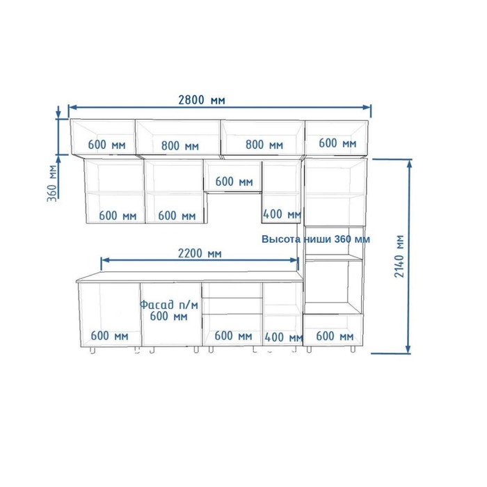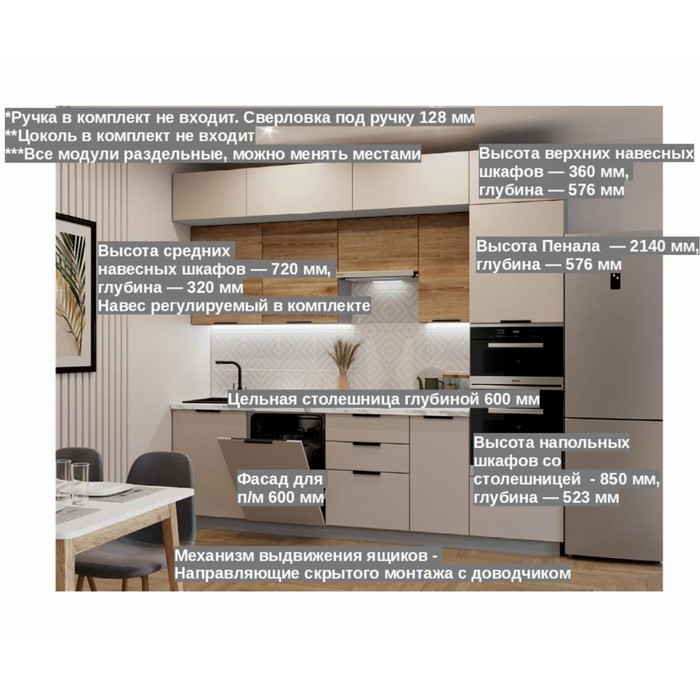 Ручки, мойка, цоколь, стеновая панель, решётка для посудосушителя приобретаются отдельно.