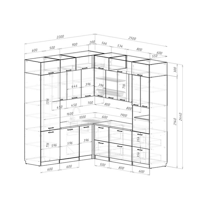 Мойки, смесители, посудосушители, варочные панели, духовые шкафы, плиты, вытяжки в комплект не входят.