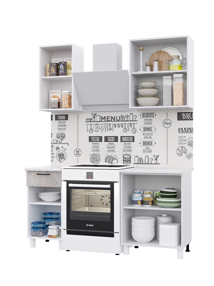 Готовое решение для создания уюта вашей кухни. Предназначен для оборудования кухонных помещений жилых квартир. Компактный лаконичный дизайн комплекта с функциональным наполнением поможет организовать хранение посуды, специй, контейнеров и прочих предметов домашнего обихода.