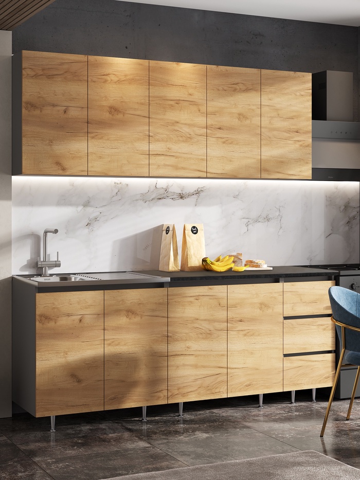 Набор мебели, предназначенный для обустройства кухни. Гарнитур обеспечивает утилитарность кухни, позволяя хранить продукты, посуду и кухонные принадлежности по местам, организует рабочее пространство для приготовления пищи. Поможет поддерживать порядок на кухне и делает процесс приготовления еды более комфортным и приятным.