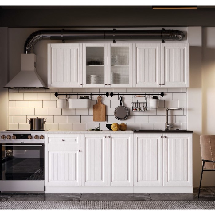 Кухонный гарнитур «Хозяюшка» - привлекает сочетанием фасадами из МДФ, и фрезеровкой, которая придает графичность и лаконичность стиля. Мебель, обладающая привлекательной эстетикой, которая создает в себе современные тенденции и характерные особенности нашего времени. Модули различных размеров, выдвижные ящики и полки обеспечивают максимальное использование пространства для хранения посуды, продуктов и других кухонных предметов. Гарнитур комплектуется подробной инструкцией по сборке, что облегчает процесс установки и позволяет собрать его без лишних усилий.