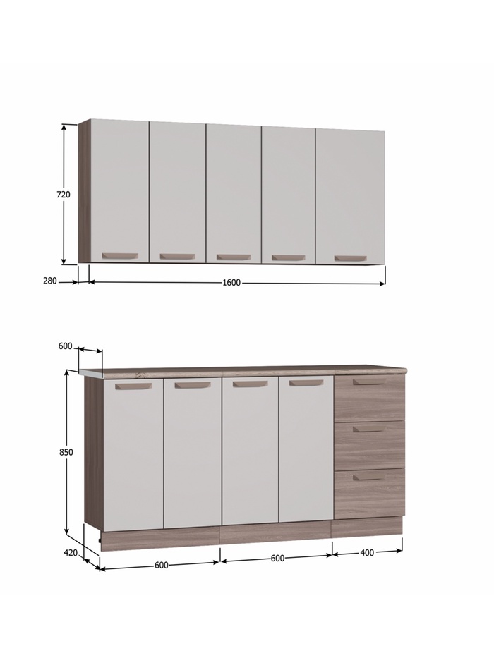 - Прочность столешницы: гарнитур оборудован двумя столешницами по 600 мм и 400 мм. Общая толщина 26 мм, устойчива к механическим повреждениям.
