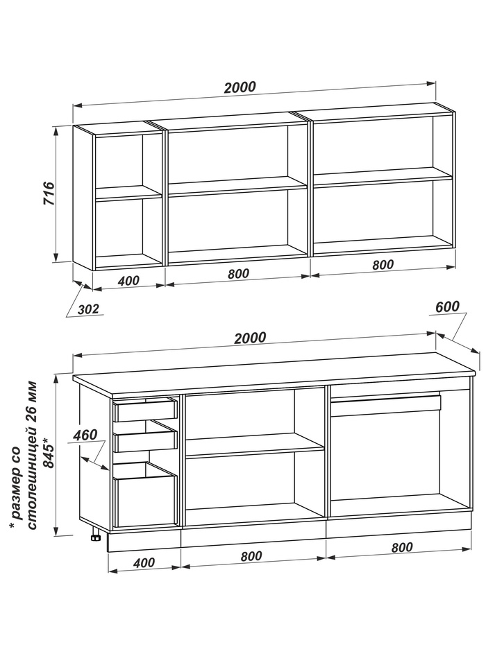 • Удобство хранения: многочисленные отсеки предоставляют место для размещения посуды, бытовой техники и продуктов.