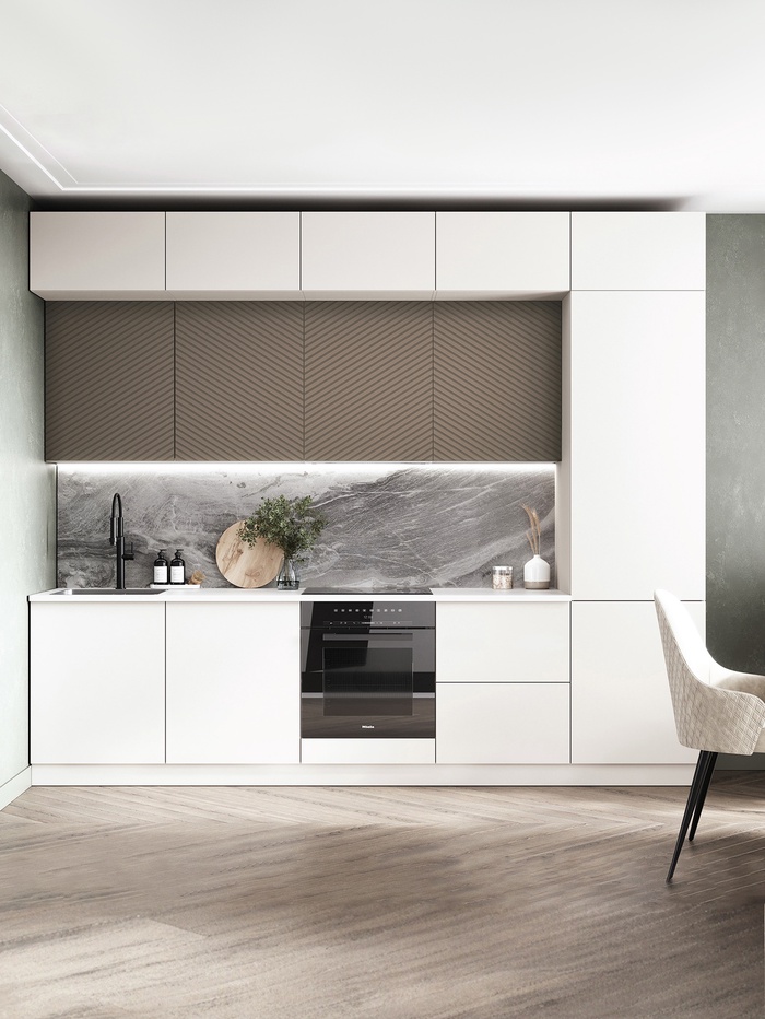 - Комфорт использования: отсутствие ручек облегчает открытие шкафчиков одним касанием («push-to-open»), позволяет комфортно пользоваться кухней каждый день.