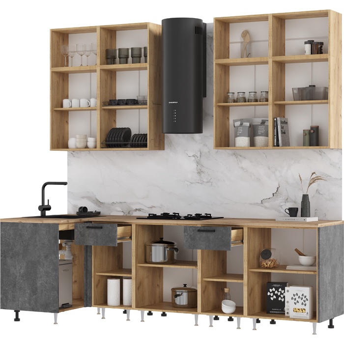 Набор мебели, предназначенный для обустройства кухни. Создан с учётом основных потребностей к кухонной мебели. Гарнитур обеспечивает утилитарность кухни, позволяя хранить продукты, посуду и кухонные принадлежности по местам, организует рабочее пространство для приготовления пищи. Поможет поддерживать порядок на кухне и делает процесс приготовления еды более комфортным и приятным.
