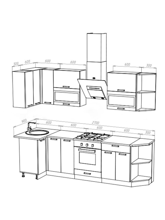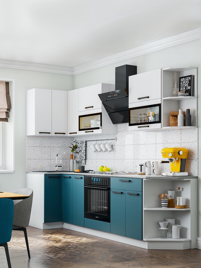 - Просторное хранение: угловая конструкция позволяет эффективно использовать пространство, обеспечивая достаточно места для хранения посуды, утвари и продуктов.