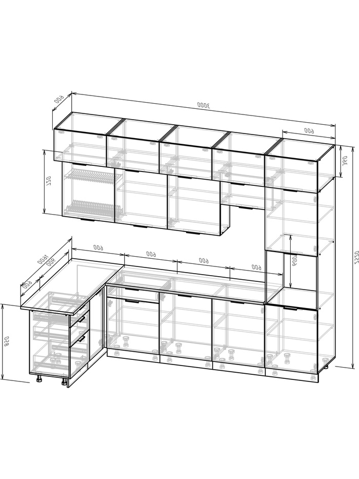 Кухонный гарнитур угловой трёхровневый под потолок «Виктория 3.1–3Я», 3000×2520×1600 мм, цвет кашемир