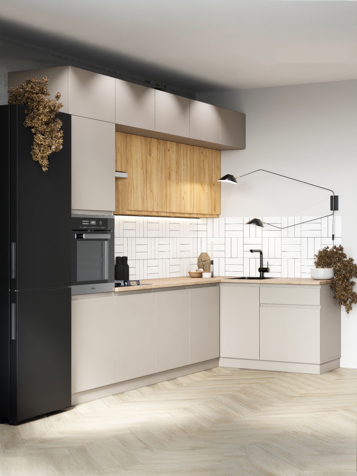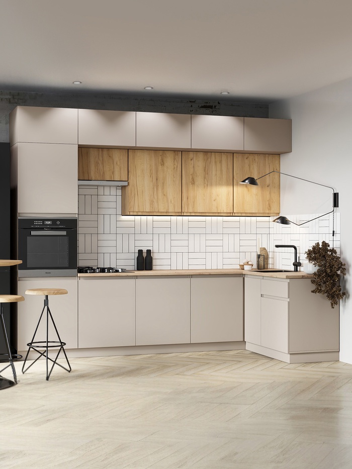 Cочетание современного стиля, функциональности и элегантности. С фасадами из ЛДСП в оттенке кашемир и столешницей из дуба крафт, станет центральным элементом вашей кухни, создавая атмосферу уюта и комфорта.