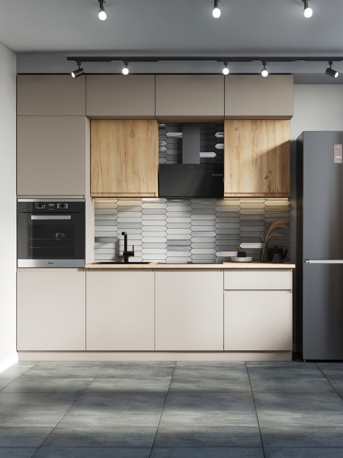 Cочетание современного стиля, функциональности и элегантности. С фасадами из ЛДСП в оттенке кашемир и столешницей из дуба крафт, станет центральным элементом вашей кухни, создавая атмосферу уюта и комфорта.