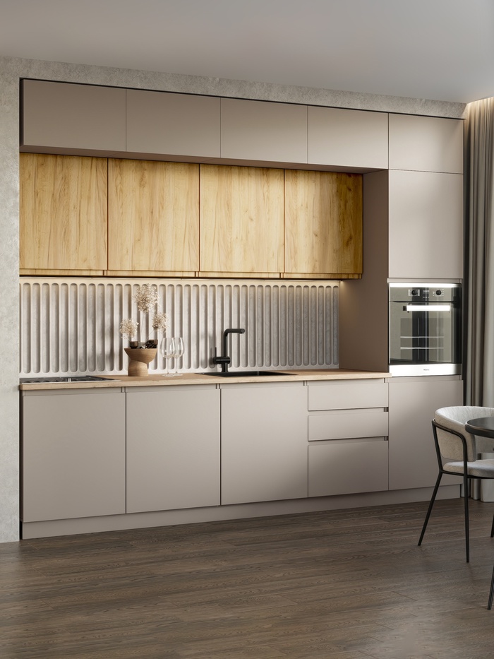 Cочетание современного стиля, функциональности и элегантности. С фасадами из ЛДСП в оттенке кашемир и столешницей из дуба крафт, станет центральным элементом вашей кухни, создавая атмосферу уюта и комфорта.