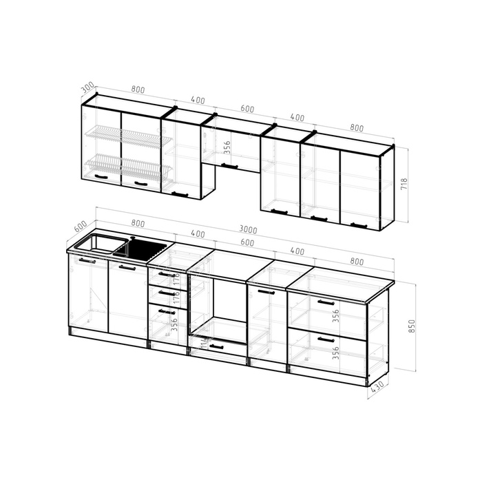 - Навесной шкаф, 2 шт.: 800 × 300 × 720 мм.