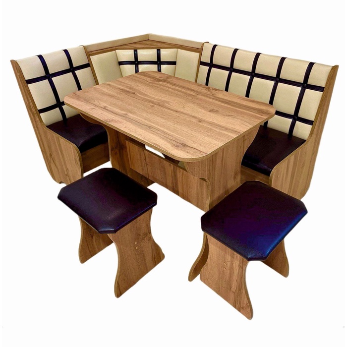 Кухонный уголок - универсальный островок для кухни, который можно собрать как на правую, так и на левую сторону на выбор. Такая модель отлично подойдет для любого вида интерьера. Широкая столешница позволит свободно разместить приготовления, прочные табуреты с мягким сиденьем практичны в использовании, а угловой диванчик имеет вместительные ящики для хранения различных вещей и предметов.