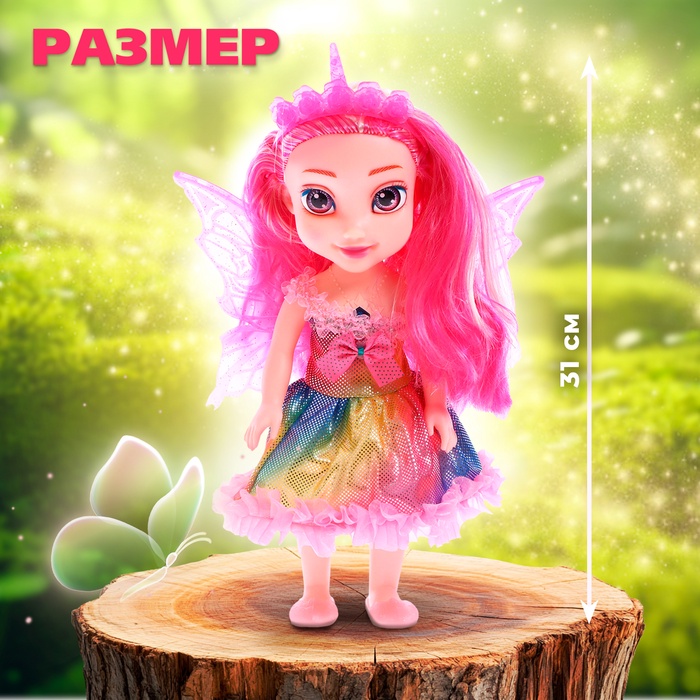 - Имеет световые эффекты (светятся платье, волосы и крылья).