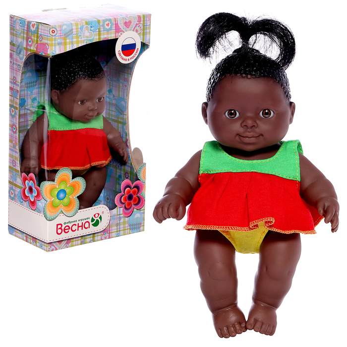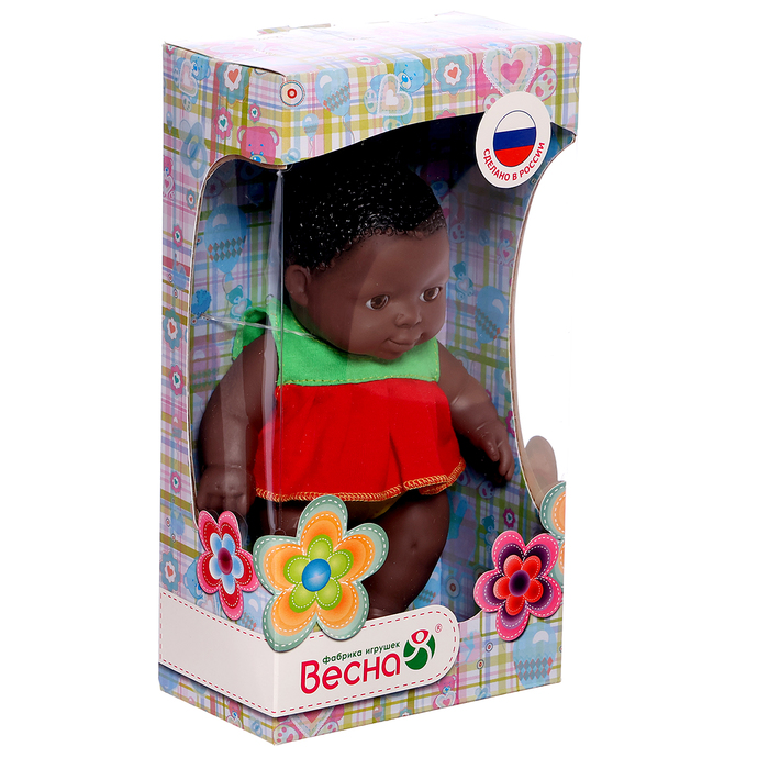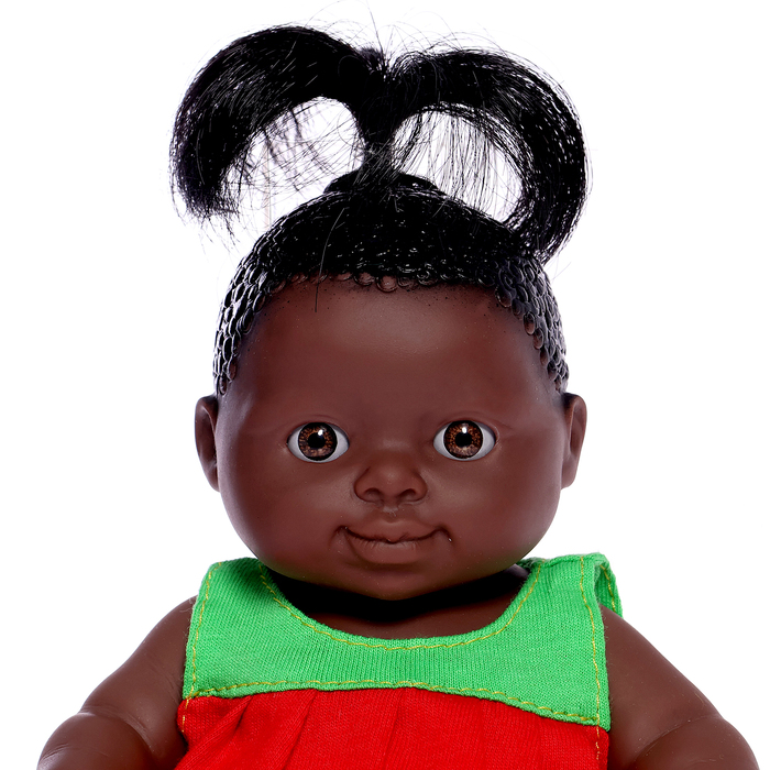 Кукла одета в платьице и трусики из бельевого трикотажа. В комплект одежды входит также трикотажная безрукавая футболка, штанишки и шапочка. Это позволит ребёнку разнообразить игровой процесс, развивая творческое воображение и мелкую моторику.