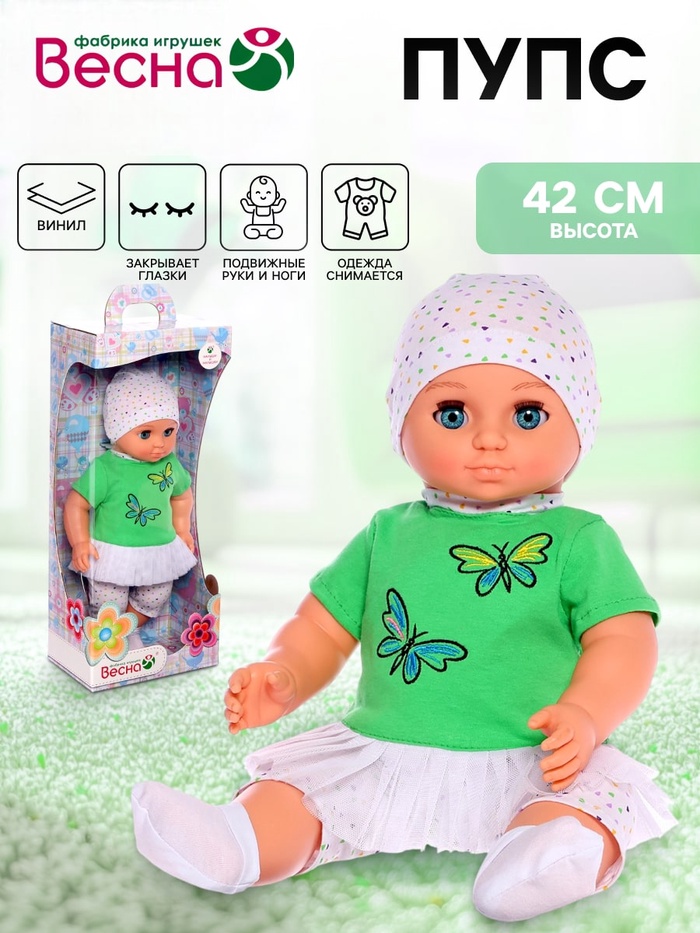 Кукла «Пупс 14» очень реалистична и похожа на настоящего ребёнка. В комплект входит трикотажная однотонная туника с короткими рукавами. Туника имеет обтачку горловины из цветного трикотажа, а также оборку по низу из мягкой сетки. Застегивается туника сзади на контактную ленту и на передней части имеет вышивку «Бабочки». В комплект также входят трикотажные разноцветные бриджи длиной чуть ниже колена, шапочка с отворотом и трикотажные носочки.