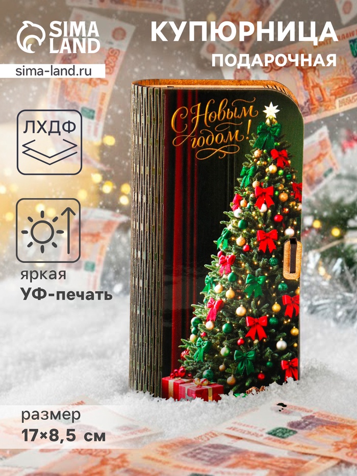 Подарочная купюрница «С Новым годом» станет изысканным сюрпризом для ваших близких и коллег. Эта прямоугольная шкатулка не только красива, но и функциональна: она сохранит в порядке ваши денежные подарки и украшения. Выполненная из качественного ЛХДФ с оригинальным печатным покрытием, она служит стильной деталью интерьера и неотъемлемым атрибутом праздника.