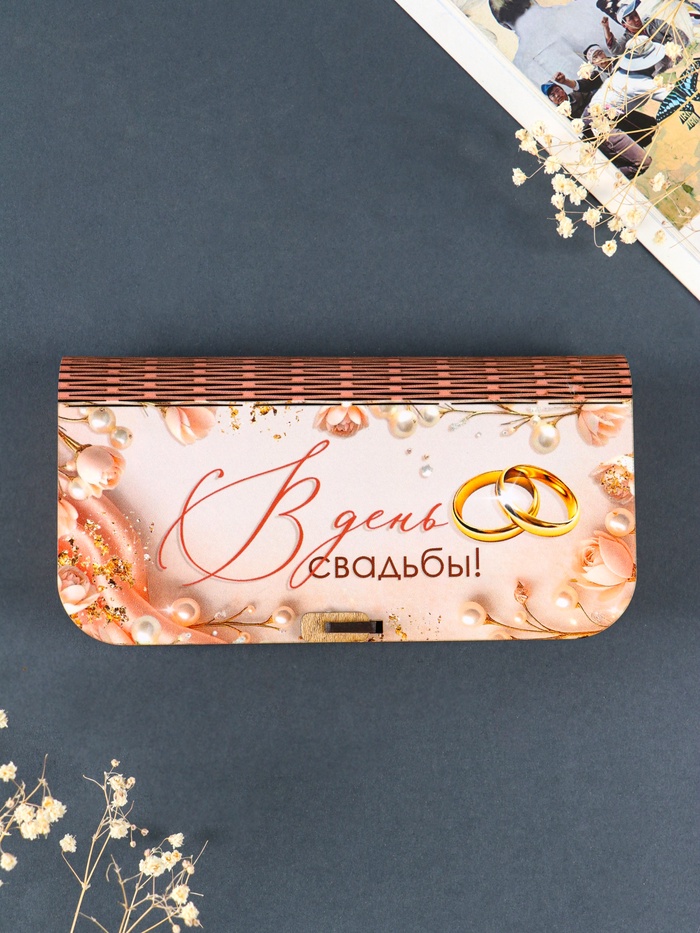Подарочная коробочка «В день свадьбы» — это изысканный способ преподнести денежный подарок или ювелирное изделие на свадьбу. Ее изящный розовый оттенок и прямоугольная форма подчеркивают значимость события, превращая момент вручения в подлинное торжество.