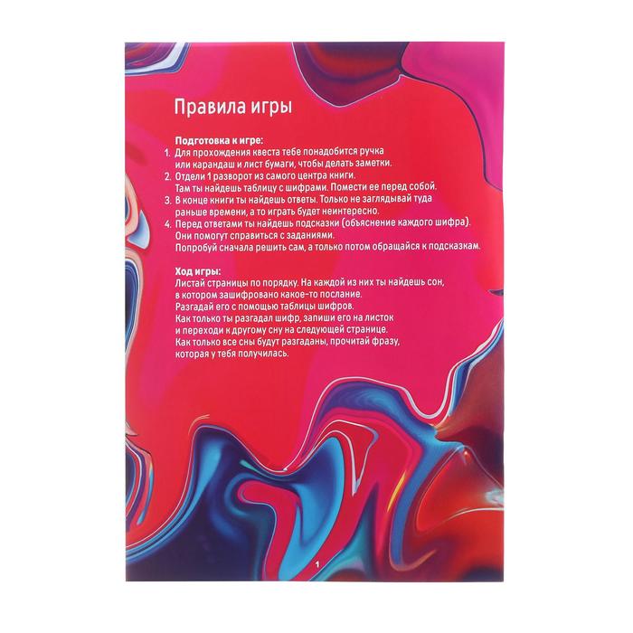 Листайте страницы по порядку. На каждой из них будет сон, в котором зашифровано какое-то послание. Разгадайте его с помощью таблицы шифров. Как только разгадали шифр, запишите его на листок и переходите к другому сну на следующей странице. Как только все сны будут разгаданы, прочитайте фразу, которая получилась.