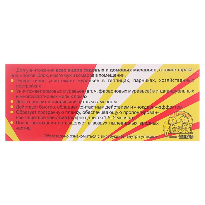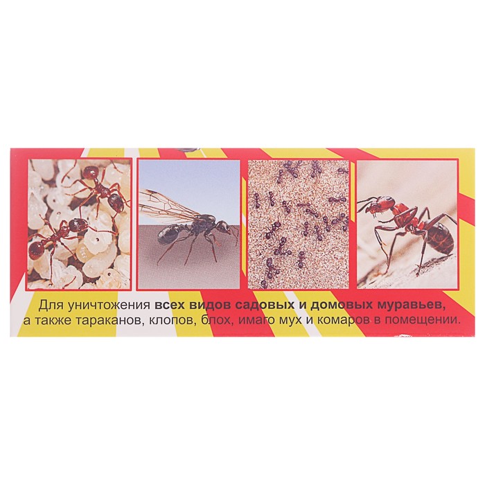 Эффективно уничтожает муравьев в теплицах, парниках, хозяйственных постройках. Уничтожает домовых муравьев (в т. ч. фараоновых муравьев) в индивидуальных и многоквартирных жилых домах.