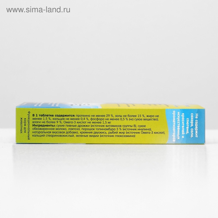 Состав: дрожжи пивные, молоко сухое, пребиотик инулин, новозеландские зелёные мидии, Омега-3 кислоты, вкусовая добавка.