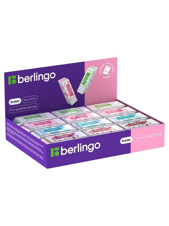 Ластики Berlingo "Aroma" выполнены из ECO-PVC. Ароматизированные, 4 запаха - мята, кола, клубника, яблоко. Не токсичны. Прекрасно справляются с линиями от чернографитного карандаша, не оставляют следов и грязных разводов после себя. Не повреждают бумагу. Каждый ластик упакован в картонный держатель и пленку, которые защищают ластик от грязи и пыли. У каждого ластика есть штрих-код. Поставляются в дисплей боксе