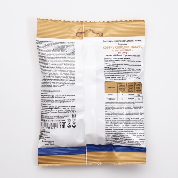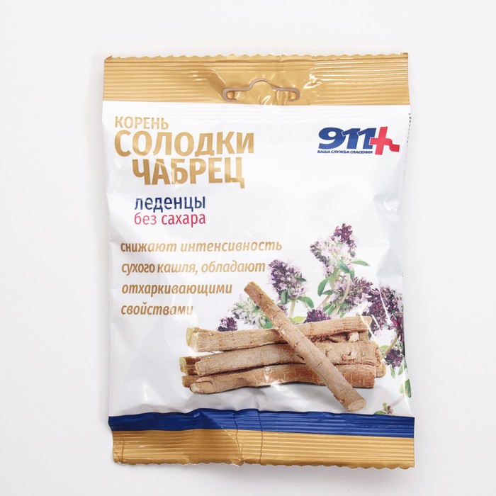 Леденцы "911" без сахара, корень солодки, чабрец, витамин С снижают интенсивность сухого кашля, обладают отхаркивающими свойствами.