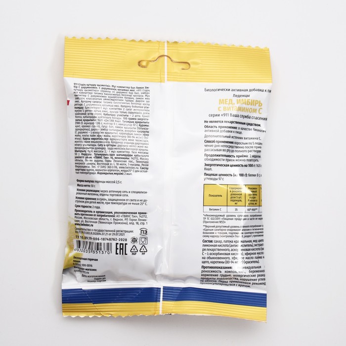 Состав: подсластитель изомальт (Е953), патока крахмальная, витамин С (аскорбиновая кислота), антиокислитель лимонная кислота (Е300), ароматизатор натуральный «лимон», экстракт корня имбиря, ароматизатор «мед».