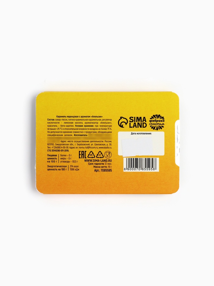 Состав: сахар-песок, патока крахмальная карамельная, регулятор кислотности - лимонная кислота, ароматизатор "Апельсин", краситель - бета-каротин.