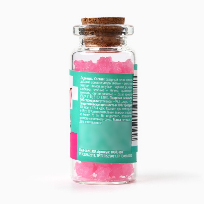 Состав: сахарный песок, пищевые добавки: ароматизаторы (белые – фруктовый, жёлтые – лимон, голубые – черника, розовые – клубника, зелёные – яблоко, оранжевые – апельсин, светло-розовые – роза), красители (Е129, Е110, Е133, Е102).